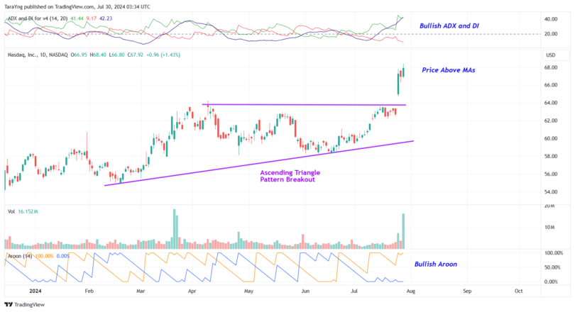 By Tara Young, Trades Of The Day,Trades Of The Day, 2024-07-30 Nasdaq, Inc. (NDAQ) seems to be poised for a price surge based on its latest charts. The company serves capital markets and other industries worldwide. It operates in...